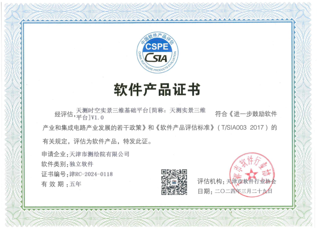 天津市測繪院有限公司自主研發(fā)的“天測時空實景三維基礎(chǔ)平臺”獲軟件產(chǎn)品證書。該證書由天津市軟件行業(yè)協(xié)會頒發(fā),標志著天津測繪院自主研發(fā)能力獲得軟件技術(shù)領(lǐng)域權(quán)威認可,公司數(shù)字化水平、創(chuàng)新能力及品牌影響力得到充分肯定。