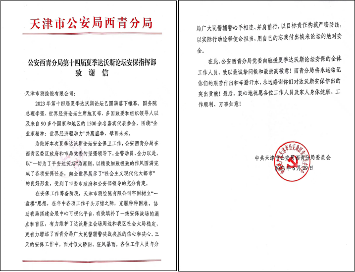 2023年6月,天津市測繪院有限公司依托實(shí)景三維技術(shù)和測繪地理信息技術(shù)協(xié)助第十四屆夏季達(dá)沃斯論壇安保指揮部快速搭建夏季達(dá)沃斯論壇安??梢暬脚_,實(shí)現(xiàn)調(diào)度和安保工作體系實(shí)時化、可視化,有效填補(bǔ)了一線指揮調(diào)度安保戰(zhàn)場的漏點(diǎn)和盲區(qū),有力維護(hù)了達(dá)沃斯主會場周邊安全和社會各界局面穩(wěn)定。6月29日,公安西青分局送來感謝信,對天津測繪院高質(zhì)量完成2023年夏季達(dá)沃斯論壇安保工作表達(dá)感謝,充分肯定了公司對達(dá)沃斯安保作出的貢獻(xiàn)。