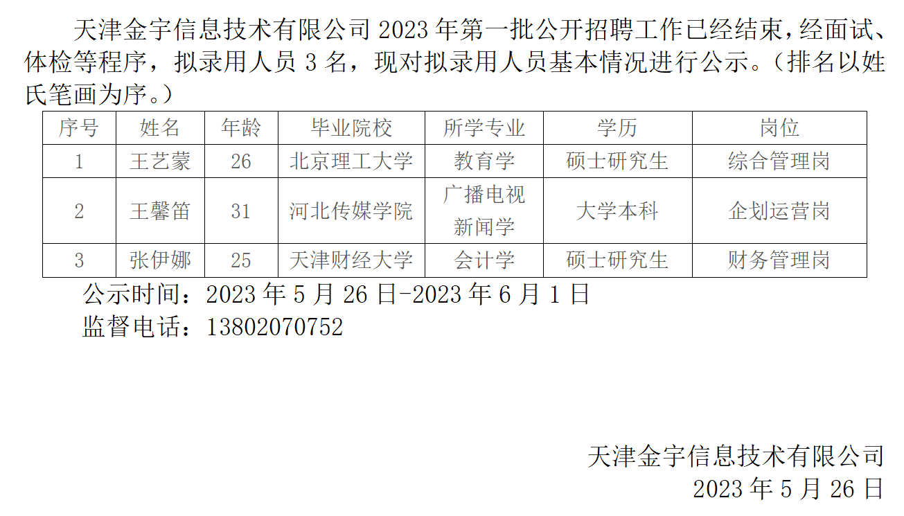上一篇:天津金宇信息技術有限公司2023年第二次公開招聘擬錄用人員名單公示