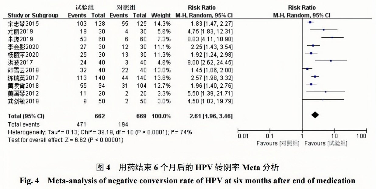 2組HPV轉(zhuǎn)陰率對比具有統(tǒng)計學意義 [RR=2.61,95% CI(1.96,3.46),P<0.00001]。見圖 4。