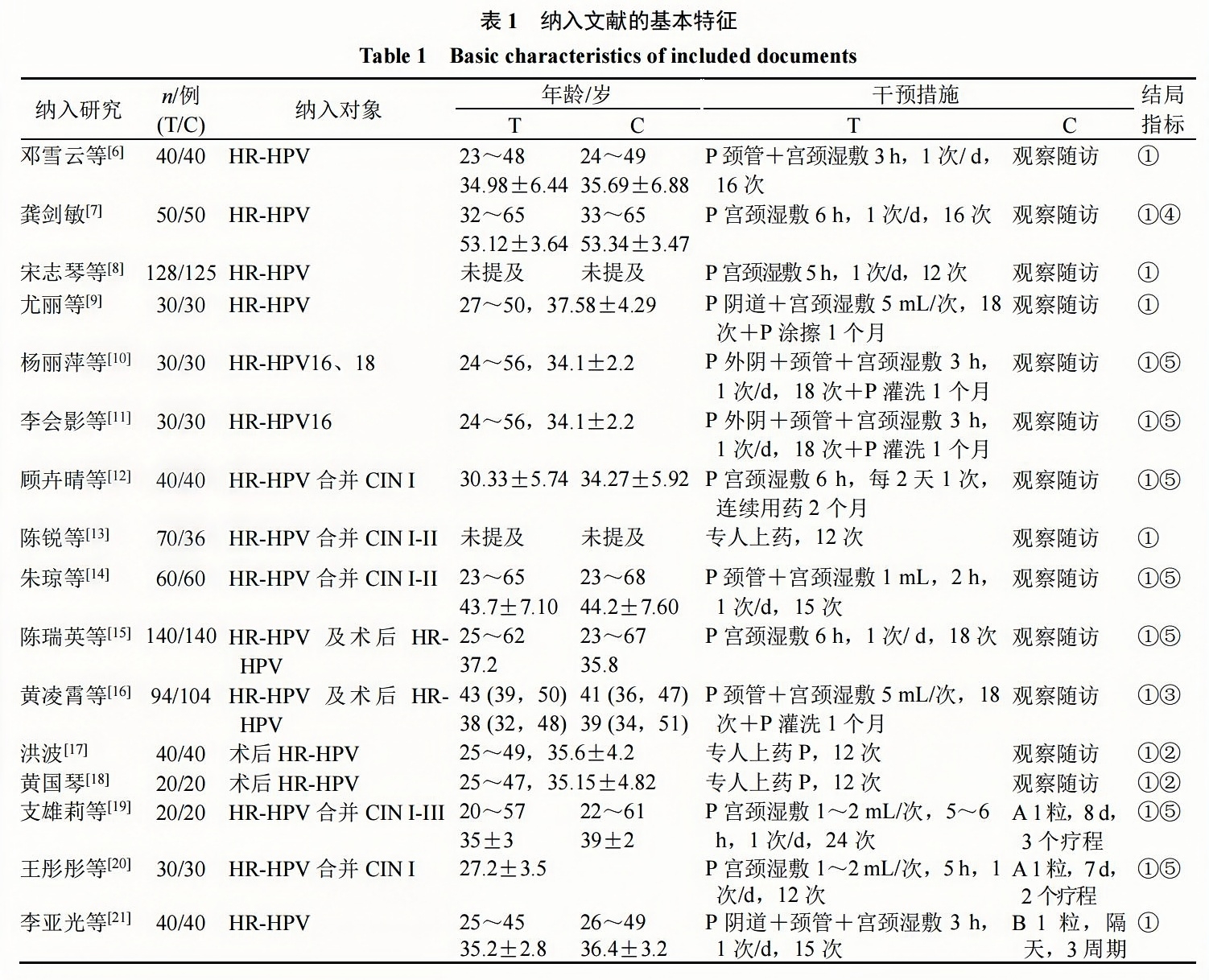 其中7項RCT[9-11,16,22-24]外加陰道涂擦或灌洗1~3個月?保婦康栓及干擾素組均為每晚睡前1粒塞陰,保婦康栓總用量為14?24粒,干擾素總用量為14?30粒?具體基本特征見表1?