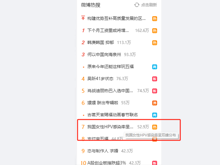 微博熱搜:女性HPV感染率呈雙峰分布