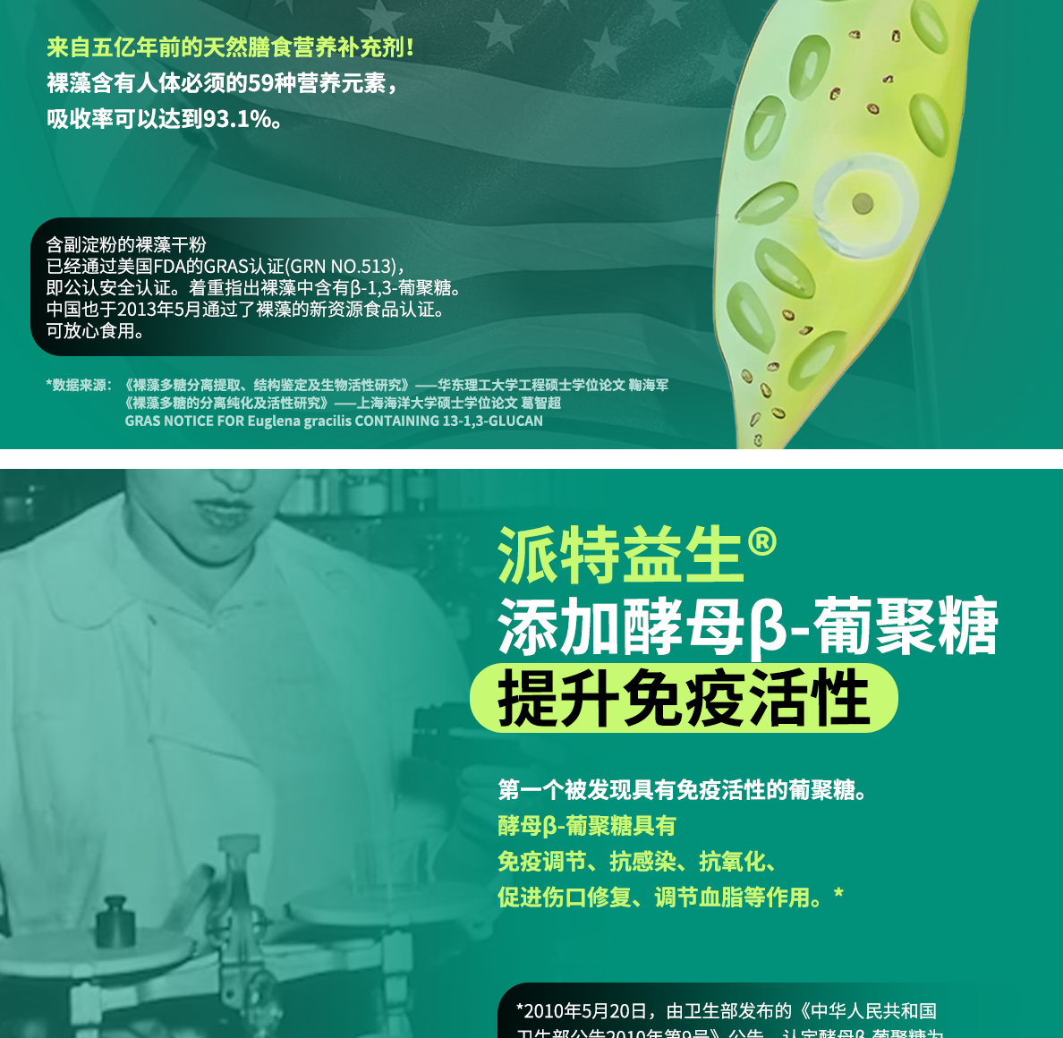 • 添加美國FDA、GRAS認(rèn)證的酵母β-葡聚糖 | 添加美國進(jìn)口裸藻粉